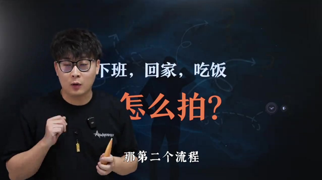 o流程拆解: 下班回家吃饭的拍摄应分为三个完整流程:1)下班流程(打卡、收拾⼯位)2)回家⽅式(打⻋/开⻋)3)吃饭准备(买菜、做饭)